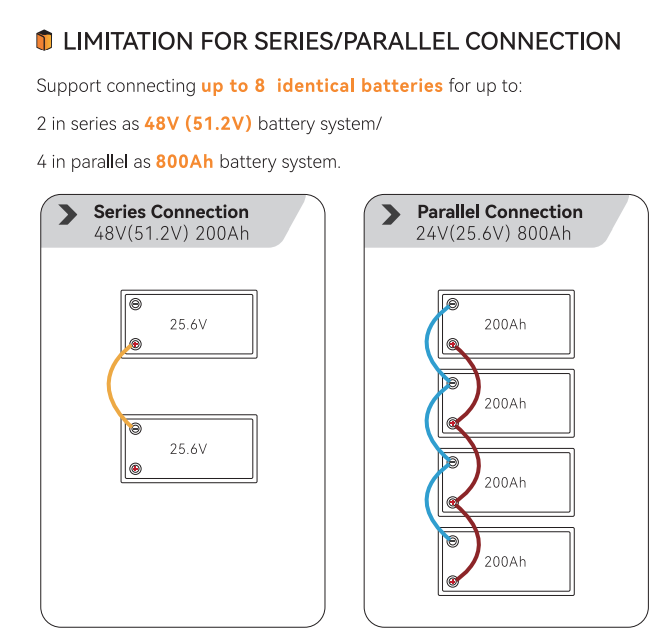 АКБ имеет компактные размеры и сравнительно небольшой вес для удобной установки в ограниченных пространствах автодомов, лодок и автономных энергетических систем. Конструкция батареи поддерживает масштабирование системы хранения энергии. Возможна последовательная и параллельная коммутация до конфигурации 4P2S, что позволяет собрать аккумуляторный массив с напряжением 51,2 В, ёмкостью 800 Ач и общей энергией до 40,96 кВтч.