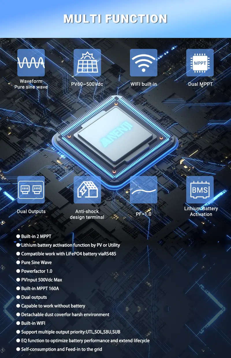 Гібридний сонячний інвертор ANJ-HHS-11KW-48V-WIFI забезпечує ефективне та інтелектуальне енергетичне рішення для дому та комерційних об'єктів, пропонуючи розширену функціональність та надійність. Він формує вихідну напругу з чистою синусоїдою, гарантуючи стабільне та якісне електроживлення для чутливого обладнання. Номінальна потужність – 11 000 Вт.