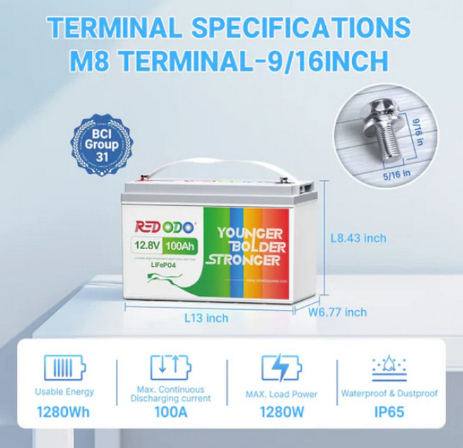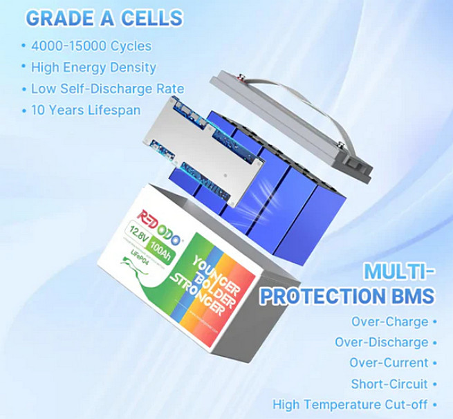 - Акумулятор Redodo LiFePo4 12V 100Ah BMS (100A) - базова модель без комплекту кабелів арт. 12732 ;