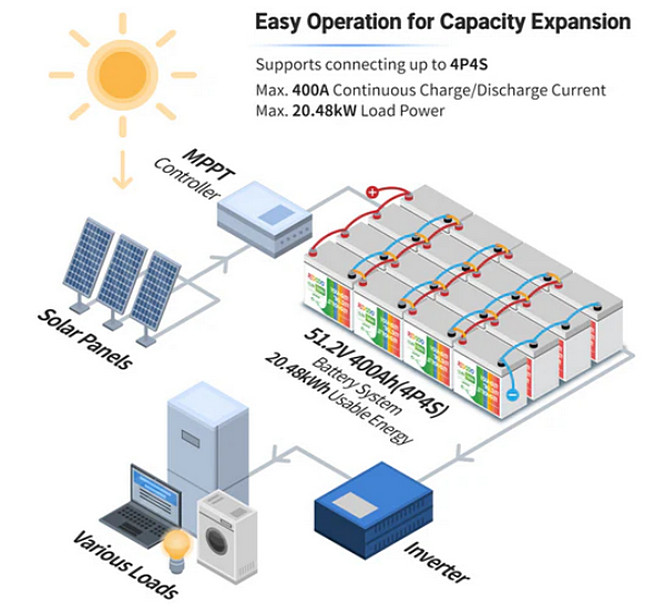 У розробці використовуються передові технології та вбудована BMS-плата на 100 А. Ця система запобігає таким поширеним проблемам, як перезаряд, перерозряд, перевантаження по струму, коротке замикання і висока температура, роблячи батарею більш безпечною та довговічною. Конструкція містить елементи LiFePO4 автомобільного класу, що відрізняються низьким рівнем саморозряду - всього 3%, що забезпечує від 4000 до 15000 циклів та великий термін експлуатації. Пристрій можна з'єднувати паралельно або послідовно збільшення ємності. Його можна розширити до 4S (послідовно) або 4P (паралельно), досягнувши максимальної ємності 400Ah або максимальної напруги 48V (51.2V). Корпус АКБ виготовлений з вогнестійкого пластику, а клас захисту IP65 свідчить про пиленепроникність та захист конструкції від водяного струменя в будь-якому напрямку.
