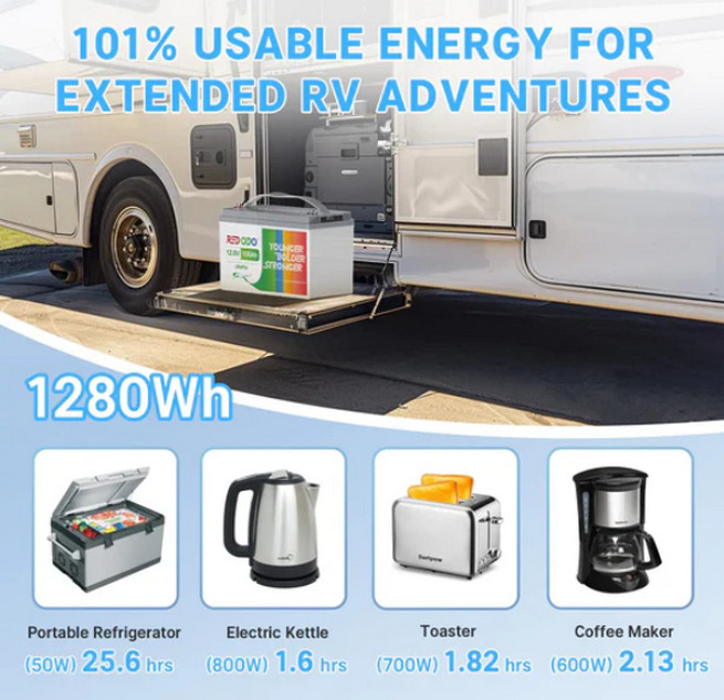 Акумулятор Redodo LiFePo4 12V 100Ah BMS (100A) - це відмінний вибір електроживлення автофургонів, що забезпечує безперебійну роботу більшості приладів. Вона чудово справляється з високою швидкістю розряду, без зусиль, підтримуючи постійну ємність в діапазоні від 101 до 105 ампер, зберігаючи безперебійну роботу протягом усього часу використання.